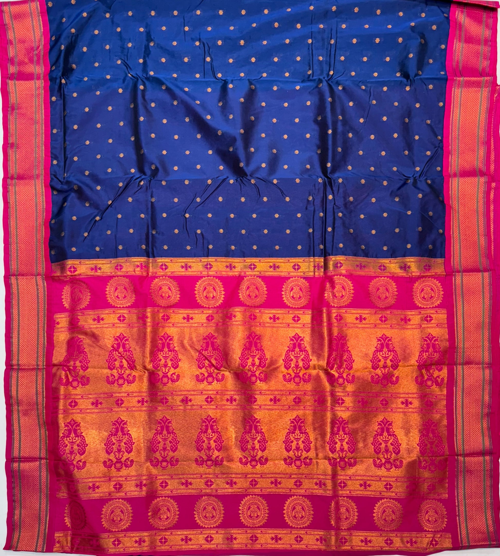 Kalanlaji Semi Paithani is one of the most trending semi paithani with the best materials and stunning Pallu and All Over Butta