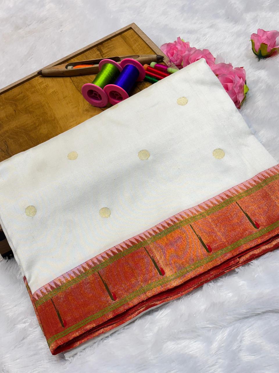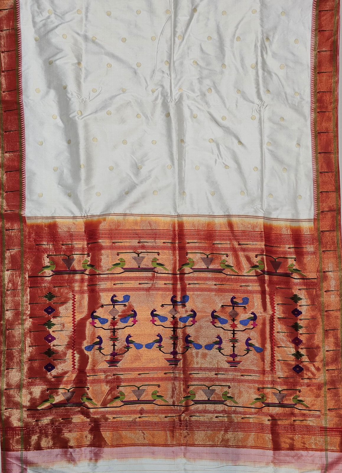 Single Muniya Paithani is a completely handwoven paithani saree, well known for its design of Muniya (peacock) on its border, Where Single Muniya means this paithani saree has one Muniya on the border separated by some distance.